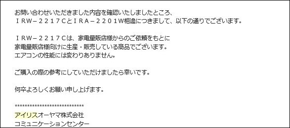 下記はアイリスオーヤマに実際に問い合わせたメールの内容です。