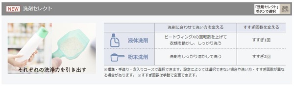 簡単に説明すると、液体洗剤か粉末洗剤かの種類を一度選択すると洗剤の種類やコースに合わせて洗い方やすすぎ回数を自動で選択する機能になります。