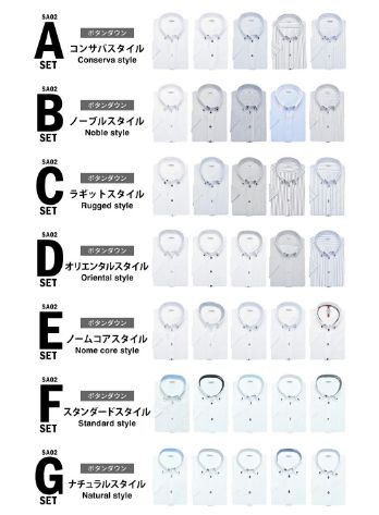デザイン的には、黒・ピンク系・ブルー系といった色味を加えた半袖Yシャツがセットになっているのと、全てボタンダウンシャツですがアトリエ365の半袖Yシャツと違って2つボタンと襟元が2枚襟(ダブルカラー)のデザインになっているシャツが入っているのが特徴的です。